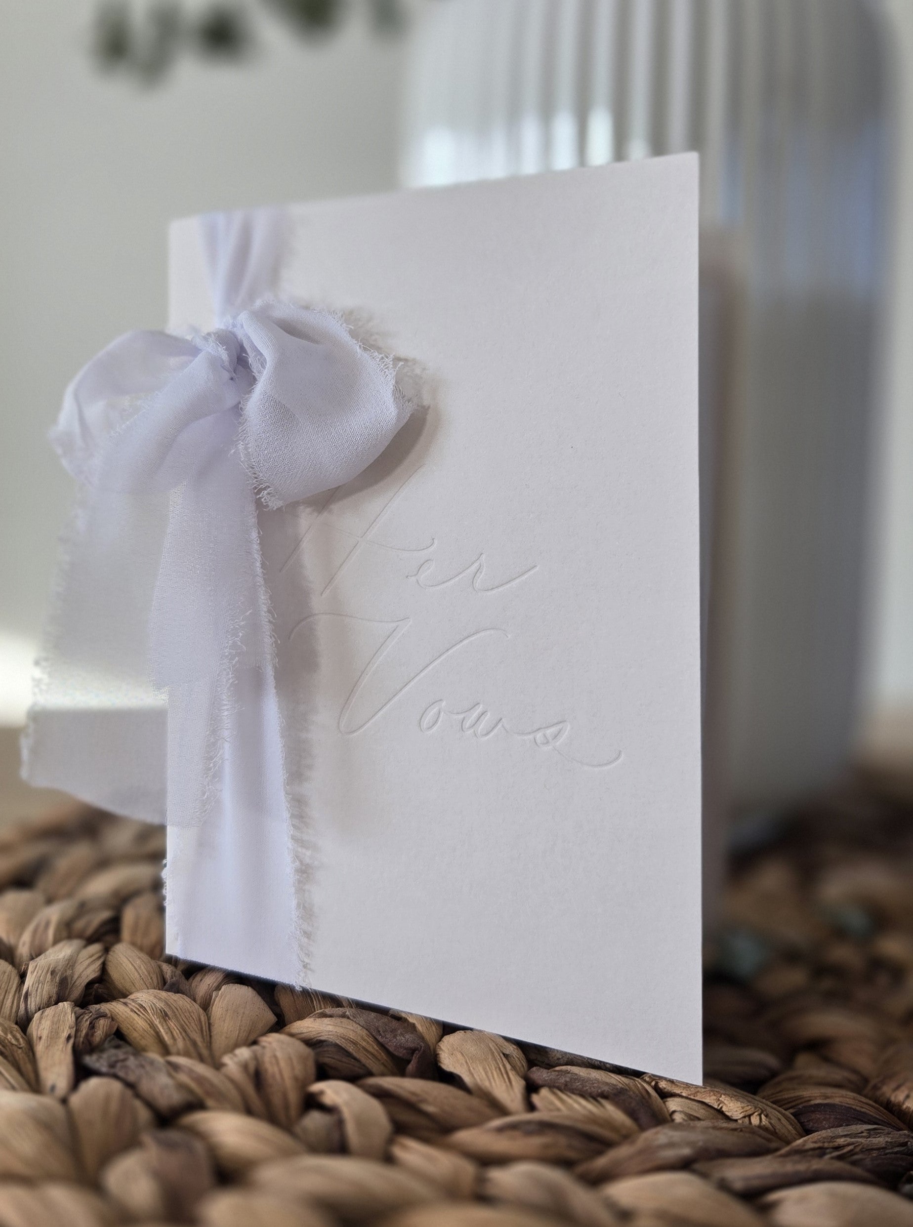 Make your vows unforgettable with our elegant His and Hers Vow Books. Designed with timeless simplicity, each book is wrapped in classic white and adorned with a soft chiffon fabric bow—perfect for adding a romantic, refined touch to your ceremony.